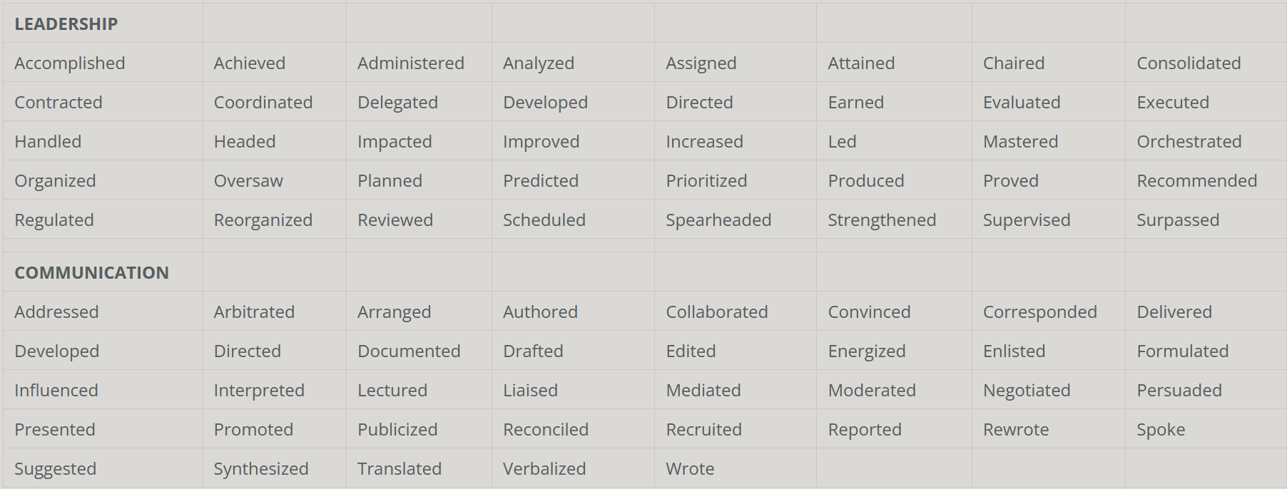 You generally want to avoid using personal pronouns (I/ we) in a resume and use strong action words. Below are some examples of words you may want to include in your resume.